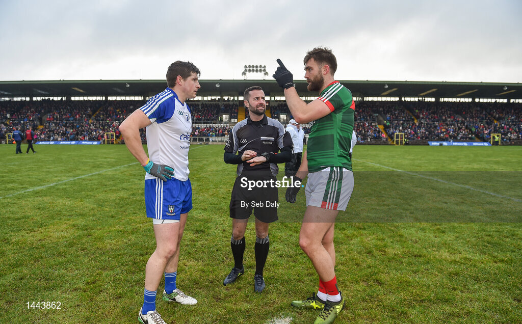 28 January 2018; Referee David Gough, with captains Darren Hughes of Monaghan, left, and Aidan O’Shea of Mayo during the coin toss prior to the Allianz Football League Division 1 Round 1 match between Monaghan and Mayo at St Tiernach's Park in Clones, County Monaghan. Photo by Seb Daly/Sportsfile