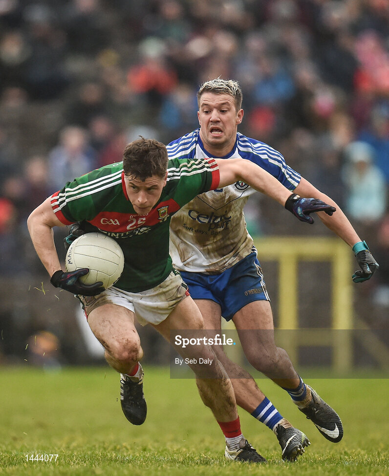28 January 2018; Neil Douglas of Mayo in action against Ryan Wylie of Monaghan during the Allianz Football League Division 1 Round 1 match between Monaghan and Mayo at St Tiernach's Park in Clones, County Monaghan. Photo by Seb Daly/Sportsfile