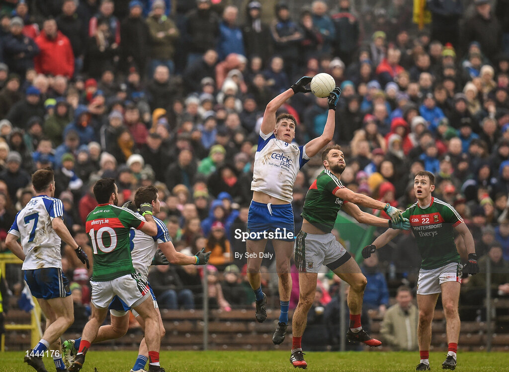28 January 2018; Niall Kearns of Monaghan in action against Jason Gibbons of Mayo during the Allianz Football League Division 1 Round 1 match between Monaghan and Mayo at St Tiernach's Park in Clones, County Monaghan. Photo by Seb Daly/Sportsfile