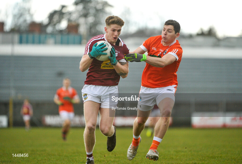 4 February 2018; Luke Loughlin of Westmeath in action against Paul Hughes of Armagh during the Allianz Football League Division 3 Round 2 match between Westmeath and Armagh at TEG Cusack Park, in Mullingar, Westmeath. Photo by Tomás Greally/Sportsfile