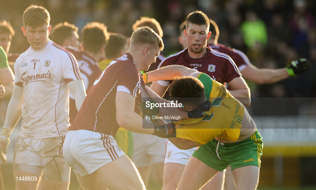 4 February 2018; Sean Andy O Ceallaigh of Galway and Niall O’Donnell of Donegal in dispute during the Allianz Football League Division 1 Round 2 match between Donegal and Galway at O'Donnell Park, in Letterkenny, Donegal. Photo by Oliver McVeigh/Sportsfile