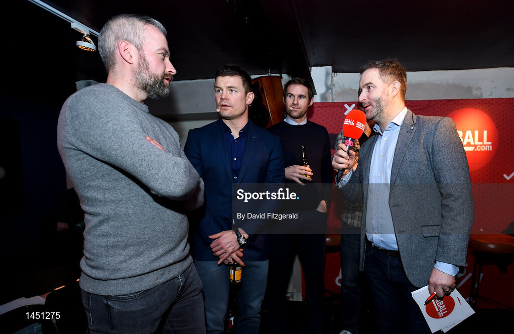 8 February 2018: Former Ireland and Leinster rugby player Brian O'Driscoll and former Ireland soccer player Kevin Kilbane take part in a quiz with members of the audience hosted by Ger Gilroy at the Off The Ball Launch at the Drury Buildings in Dublin. Photo by David Fitzgerald/Sportsfile