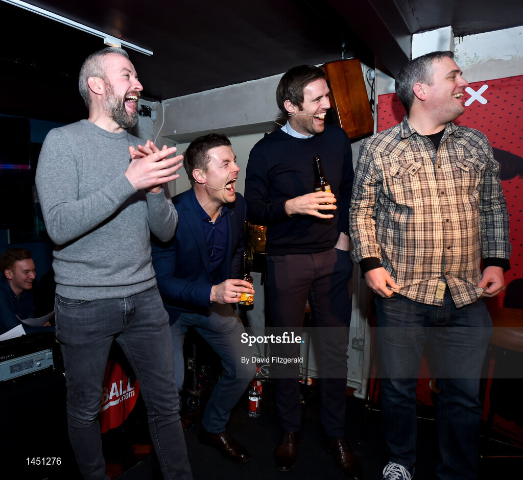 8 February 2018: Attendees, from left, former Leinster and Ireland rugby player Brian O'Driscoll and former Ireland soccer player, Kevin Kilbane take part in a quiz with members of the audience at the Off The Ball Launch at the Drury Buildings in Dublin. Photo by David Fitzgerald/Sportsfile