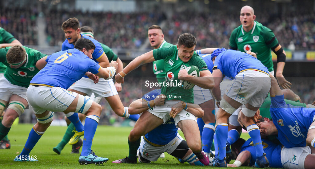 10 February 2018; Jacob Stockdale of Ireland is stopped short of the line during the Six Nations Rugby Championship match between Ireland and Italy at the Aviva Stadium in Dublin.