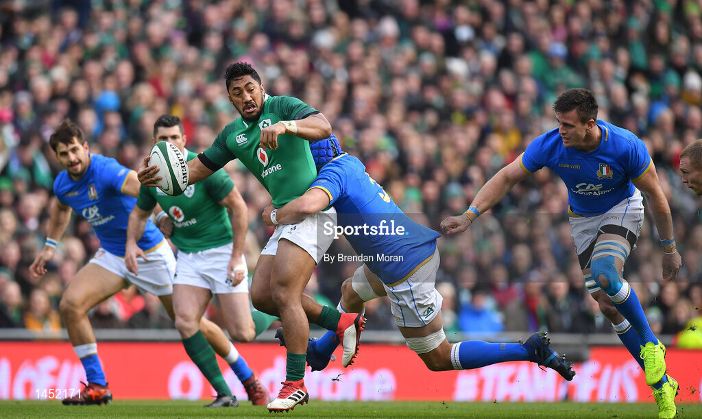 10 February 2018; Bundee Aki of Ireland is tackled by Dean Budd of Italy during the Six Nations Rugby Championship match between Ireland and Italy at the Aviva Stadium in Dublin. Photo by Brendan Moran/Sportsfile