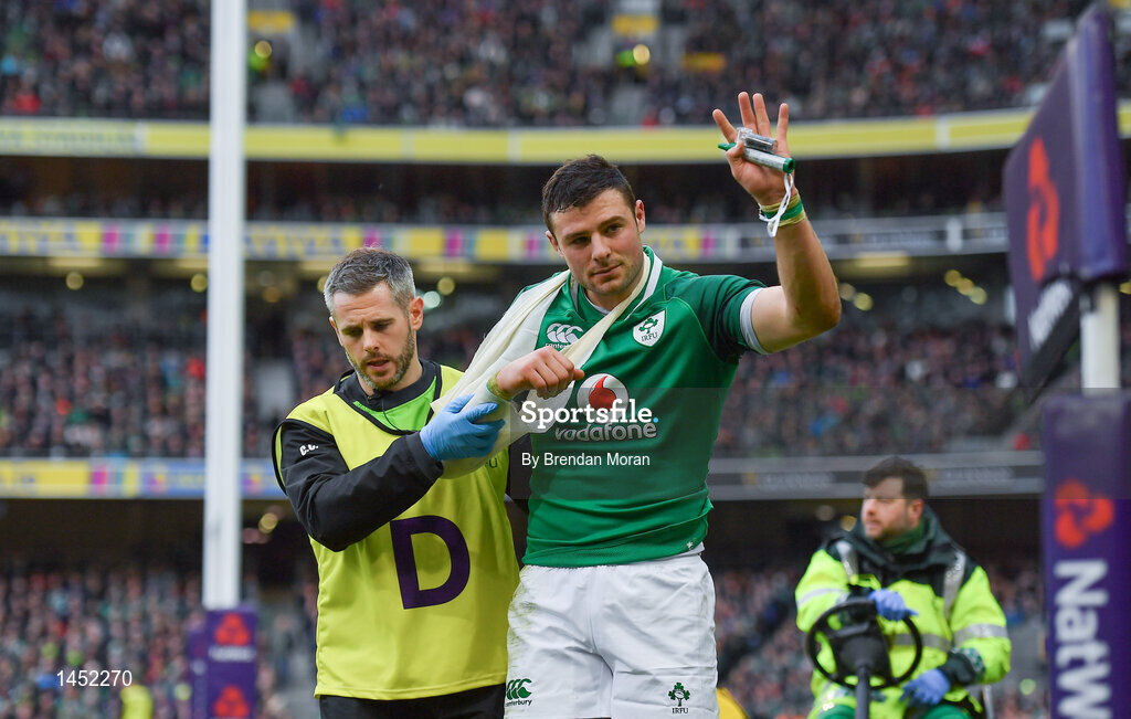 10 February 2018; Robbie Henshaw of Ireland acknowledges the supporters after leaving the field with an injury during the Six Nations Rugby Championship match between Ireland and Italy at the Aviva Stadium in Dublin. Photo by Brendan Moran/Sportsfile