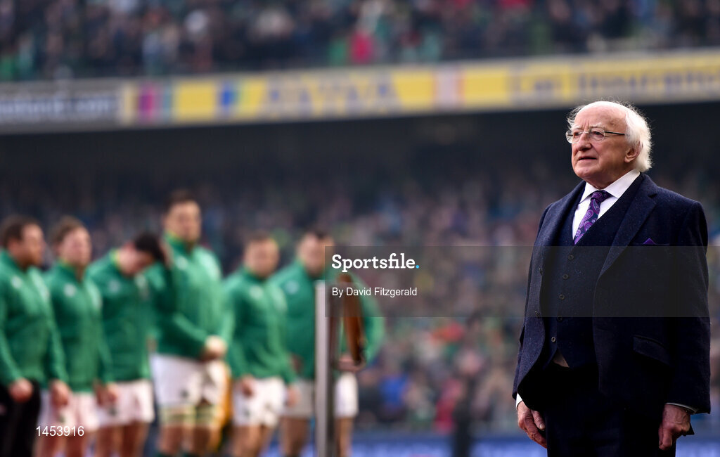 10 February 2018; President of Ireland Michael D. Higgins stands for the national anthem prior to the Six Nations Rugby Championship match between Ireland and Italy at the Aviva Stadium in Dublin. Photo by David Fitzgerald/Sportsfile