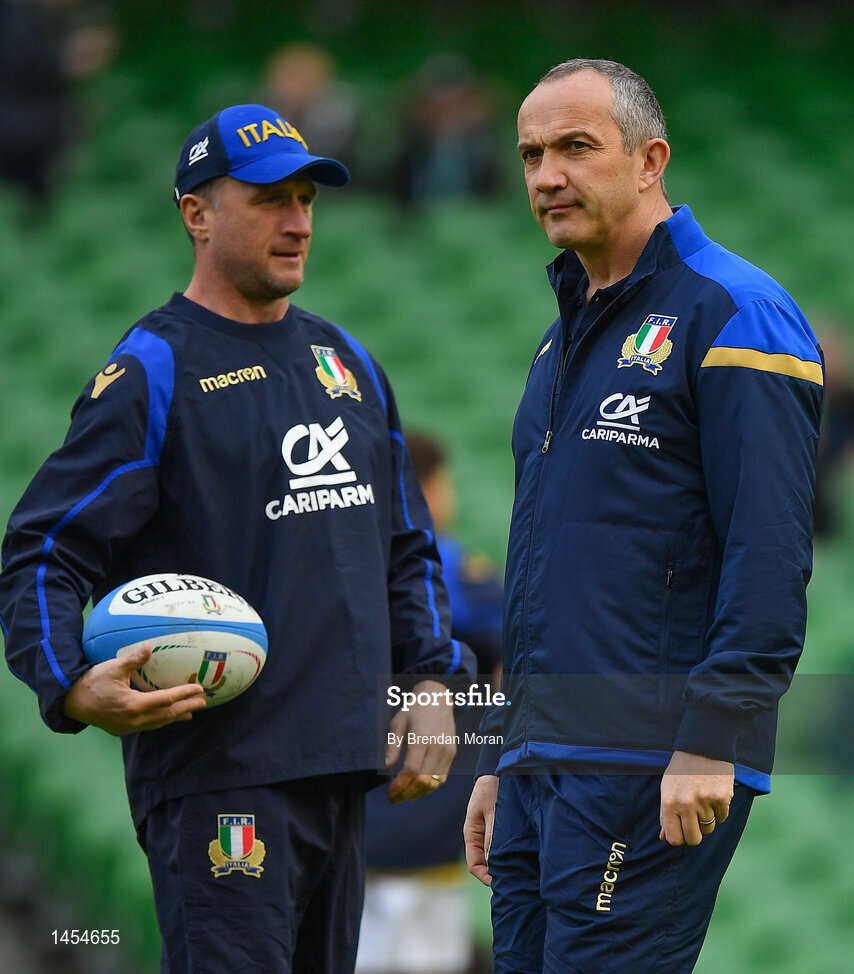10 February 2018; Italy head coach Conor O'Shea, right, with attack coach Mike Catt prior to the Six Nations Rugby Championship match between Ireland and Italy at the Aviva Stadium in Dublin. Photo by Brendan Moran/Sportsfile