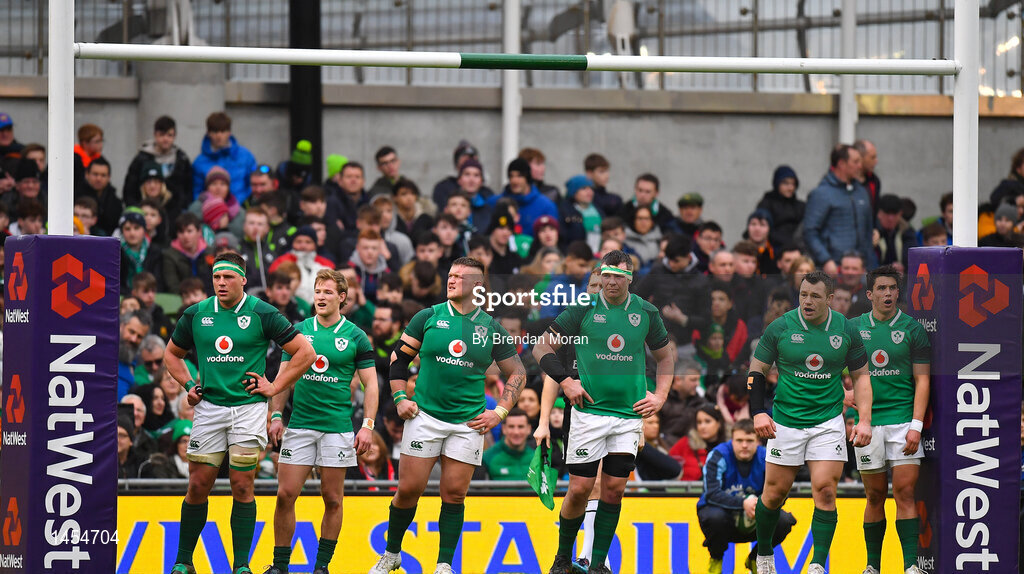10 February 2018; Ireland players await a try conversion to be taken by Italy during the Six Nations Rugby Championship match between Ireland and Italy at the Aviva Stadium in Dublin. Photo by Brendan Moran/Sportsfile