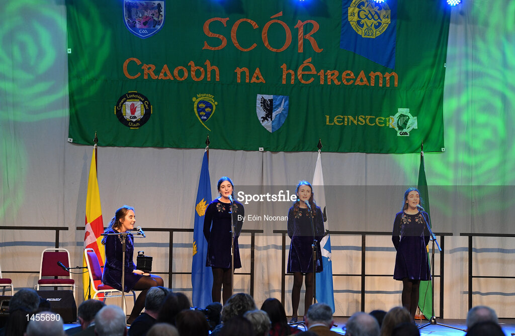 17 February 2018; Ava Brogan, Róisín Noone, Elsie Harman, Eleanor Smith and Ríonach Nic Conmara from St. Mary's Carrick-on-Shannon, Leitrim, competing in the Ballad Groups category during the All-Ireland Scór na nÓg Final 2018 at the Knocknarea Arena in Sligo IT, Sligo. Photo by Eóin Noonan/Sportsfile