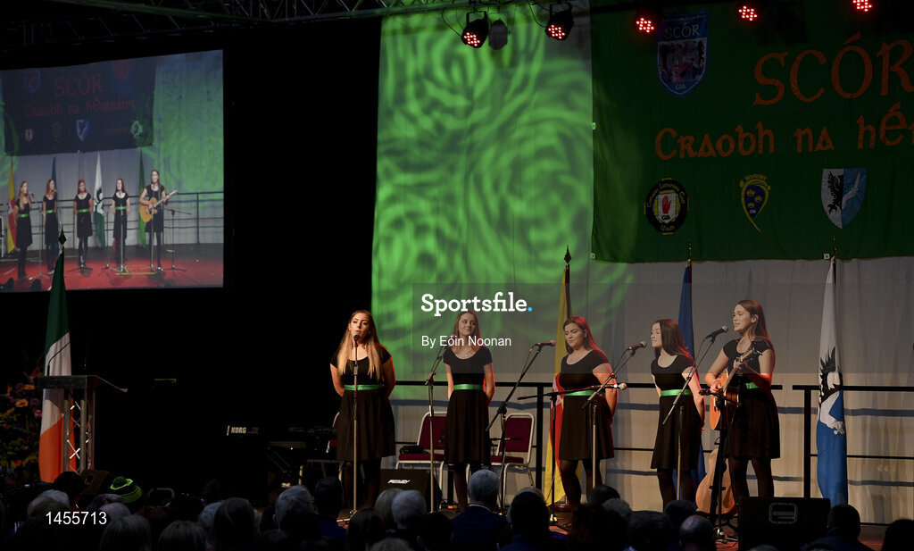 17 February 2018; Olivia Whelan, Alanna McKeon, Michelle Mollaghan, Anna Moorehead and Niamh O’Brien from Emmet Óg Killoe, Longford, competing in the Ballad Groups category during the All-Ireland Scór na nÓg Final 2018 at the Knocknarea Arena in Sligo IT, Sligo. Photo by Eóin Noonan/Sportsfile
