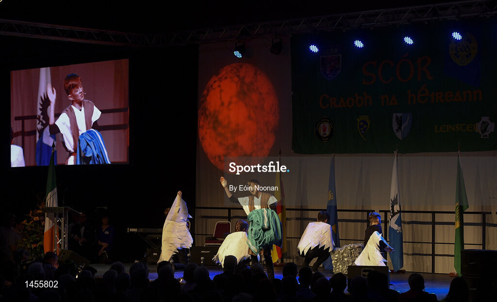 17 February 2018; Courtney Kelly, Áine Keenan, Ina Van Opstal, Shane Murphy, Karol Feerick, Lorcan Kelly, Keelan Morris and Ryan O’Keeffe from St Dominic's, Roscommon, competing in the Stage Presentation category during the All-Ireland Scór na nÓg Final 2018 at the Knocknarea Arena in Sligo IT, Sligo. Photo by Eóin Noonan/Sportsfile