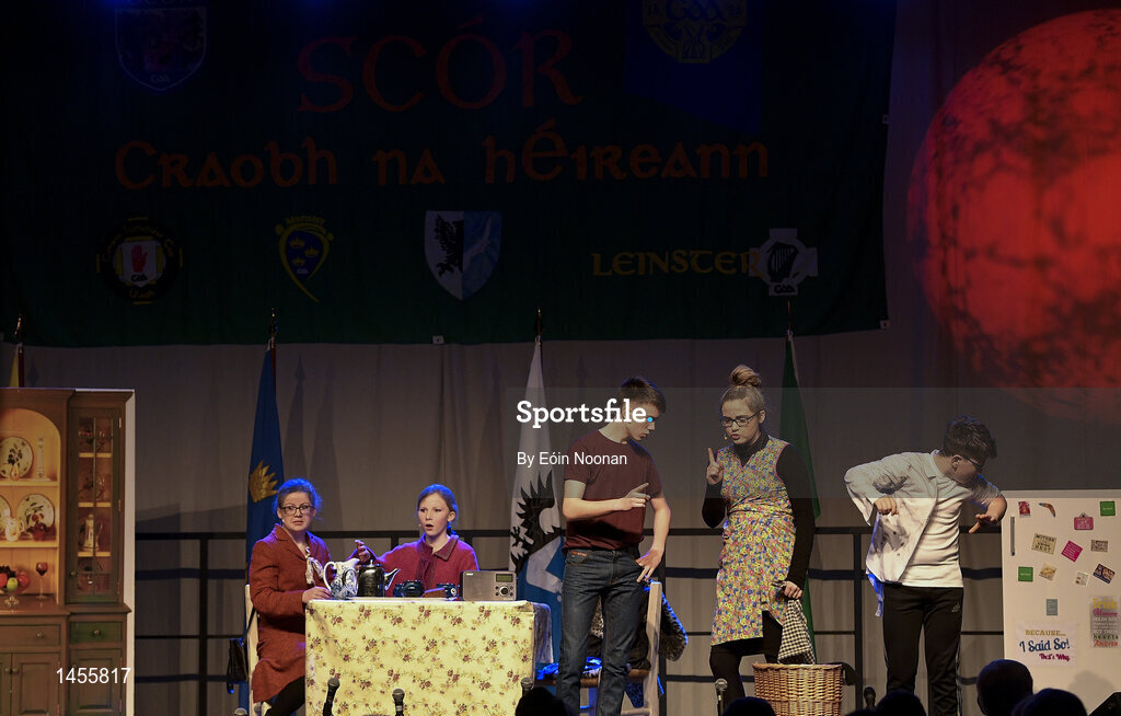 17 February 2018; Barry Sugrue, Emily Crowe, Isabelle Crowe, Joshua Roche, Liam Kingston, Áine O’Sullivan, Aoife O’Sullivan and Dearbhla Quirke from Na Gaeil, Kerry, competing in the Stage Presentation category during the All-Ireland Scór na nÓg Final 2018 at the Knocknarea Arena in Sligo IT, Sligo. Photo by Eóin Noonan/Sportsfile