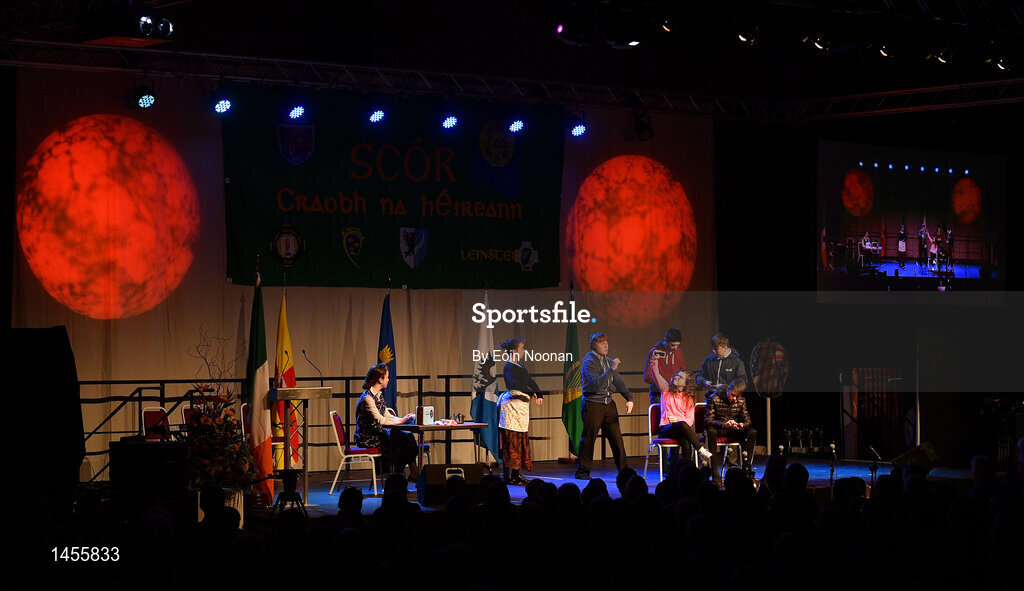 17 February 2018; Emily Shaw, Katie Moore, Grace O’Neill, Alan Colgan, Tom Tuite, Dónal Doherty, Ryan Molloy and Rory Shiel from The Downs, Westmeath, competing in the Stage Presentation category during the All-Ireland Scór na nÓg Final 2018 at the Knocknarea Arena in Sligo IT, Sligo. Photo by Eóin Noonan/Sportsfile