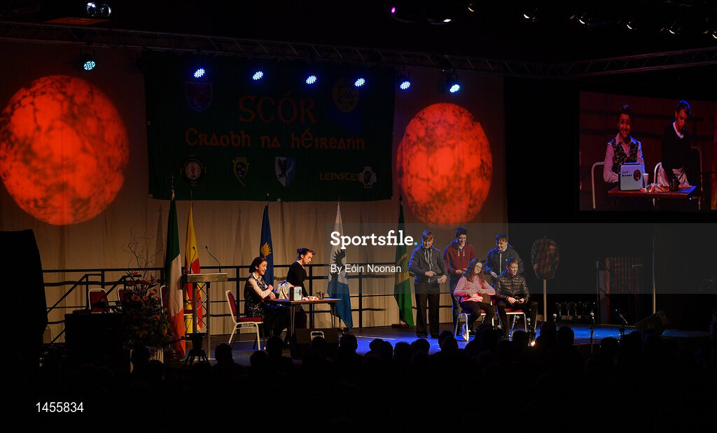 17 February 2018; Emily Shaw, Katie Moore, Grace O’Neill, Alan Colgan, Tom Tuite, Dónal Doherty, Ryan Molloy and Rory Shiel from The Downs, Westmeath, competing in the Stage Presentation category during the All-Ireland Scór na nÓg Final 2018 at the Knocknarea Arena in Sligo IT, Sligo. Photo by Eóin Noonan/Sportsfile