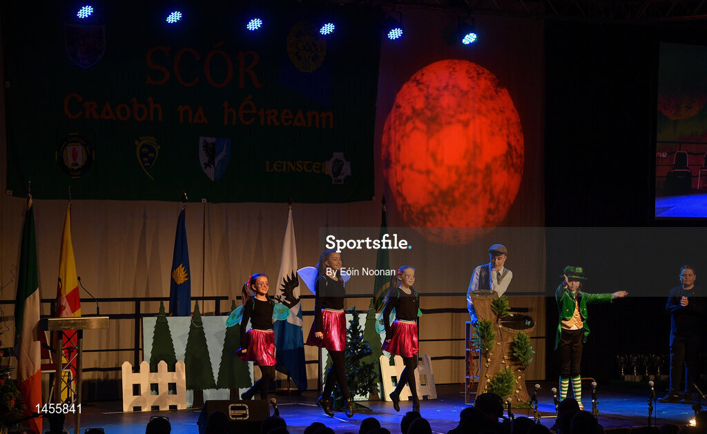 17 February 2018; Daniel McCavigan, Meabh McCavigan, Zara McCavigan, Eadaoin Maginn, Una Maginn, Oisin McStravick, Ronan O’Connor and Ciara O’Connor from St. Mary's Aghagallon, Antrim, competing in the Stage Presentation category during the All-Ireland Scór na nÓg Final 2018 at the Knocknarea Arena in Sligo IT, Sligo. Photo by Eóin Noonan/Sportsfile
