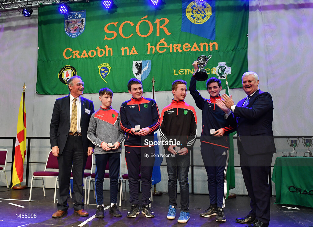 17 February 2018; Emmet Martin, Peter Doyle, William McGibney and Martin McGibney representing Co. Cavan being presented with the cup by Uachtarán Chumann Lúthchleas Gael Aogán Ó Fearghail after winning the table quiz during the All-Ireland Scór na nÓg Final 2018 at the Knocknarea Arena in Sligo IT, Sligo. Photo by Eóin Noonan/Sportsfile