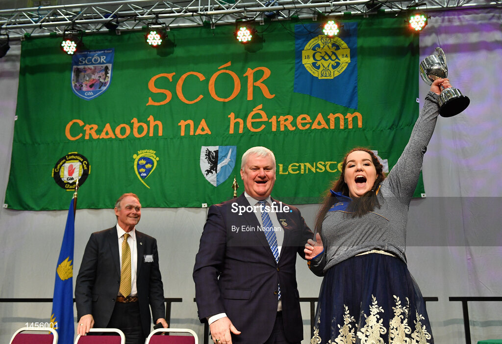 17 February 2018; Maggie Moynihan from Cullen, Cork, lifts the cup after winning the solo singing category during the All-Ireland Scór na nÓg Final 2018 at the Knocknarea Arena in Sligo IT, Sligo. Photo by Eóin Noonan/Sportsfile