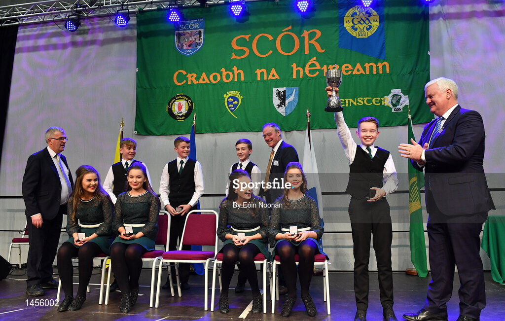 17 February 2018; Luí Duffy is presented with the cup by Uachtarán Chumann Lúthchleas Gael Aogán Ó Fearghail alongside team mates Tiernan Breslin, Dylan Phillips, Shane Kavanagh, Ellen Cromie, Orla McGuinness, Aimee McAteer and Hannah McManus from Killeavy, Armagh, after winning the Rince Foirne category during the All-Ireland Scór na nÓg Final 2018 at the Knocknarea Arena in Sligo IT, Sligo. Photo by Eóin Noonan/Sportsfile
