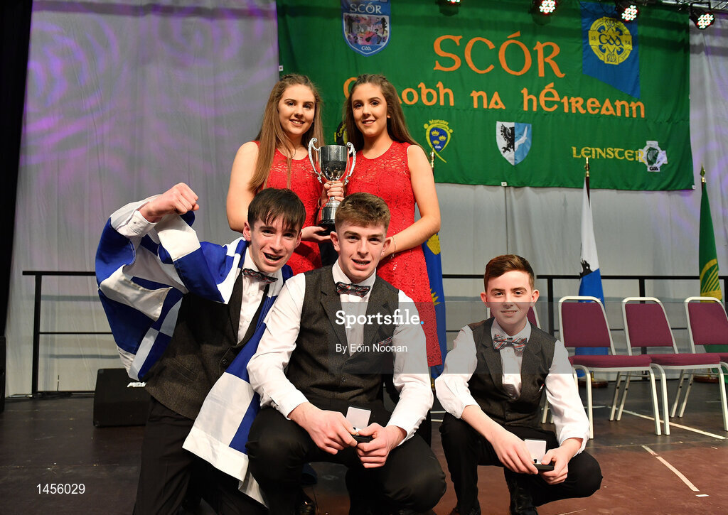 17 February 2018; David Scott, Ellen Scott, Maeve Scott, Peter Bennett and Conall Ó Cnáimhín from Borris/Kilcotton, Laois, celebrate after winning the Instrumental Music category during the All-Ireland Scór na nÓg Final 2018 at the Knocknarea Arena in Sligo IT, Sligo. Photo by Eóin Noonan/Sportsfile