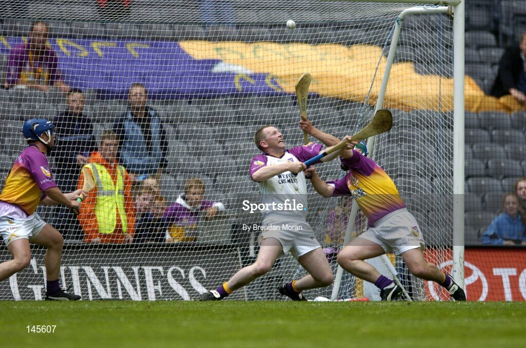 4 July 2004; Wexford goalkeeper Damien Fitzhenry and Paul Carley combine to stop a penalty by Offaly's Damien Murray. Guinness Leinster Senior Hurling Championship Final, Offaly v Wexford, Croke Park, Dublin. Picture credit; Brendan Moran / SPORTSFILE