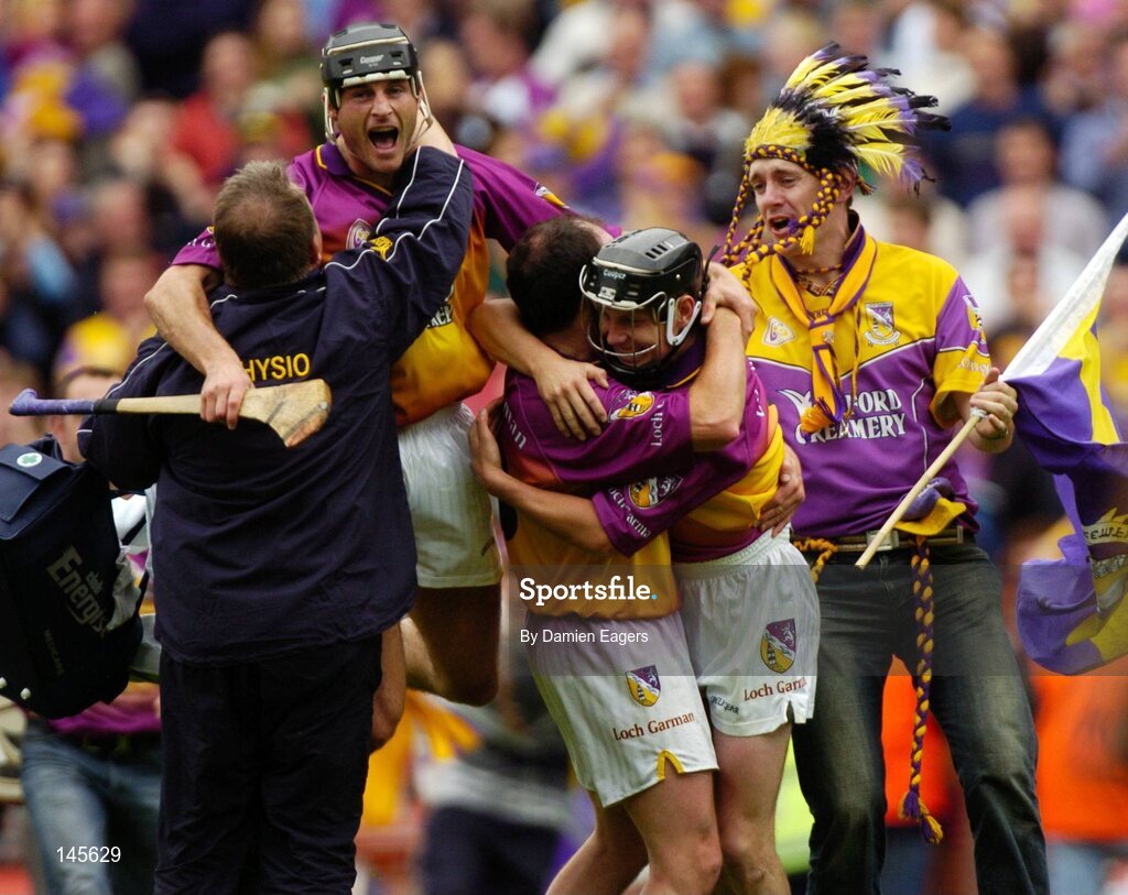 4 July 2004; Wexford players from (left to right) are Rory McCarthy, Adrian Fenlon and Michael Jacob as they celebrate with the Wexford physio and a supporter. Guinness Leinster Senior Hurling Championship Final, Offaly v Wexford, Croke Park, Dublin. Picture credit; Damien Eagers / SPORTSFILE