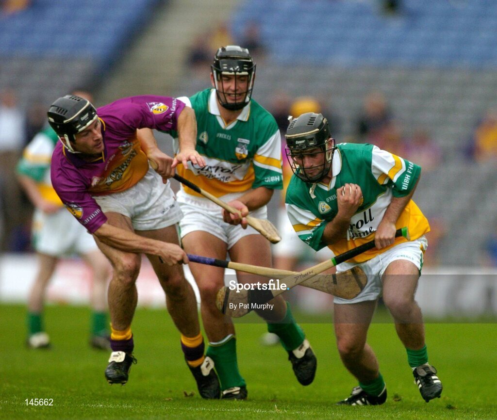 4 July 2004; Damien Murray, Offaly, supported by team-mate Gary Hanniffy, centre, in action against Declan Ruth, Wexford. Guinness Leinster Senior Hurling Championship Final, Offaly v Wexford, Croke Park, Dublin. Picture credit; Pat Murphy / SPORTSFILE