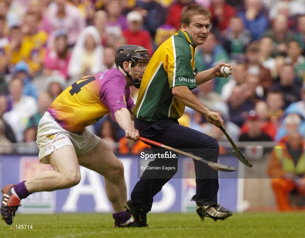 4 July 2004; Brian Mullins, Offaly goalkeeper, in action against Michael Jacob, Wexford. Guinness Leinster Senior Hurling Championship Final, Offaly v Wexford, Croke Park, Dublin. Picture credit; Damien Eagers / SPORTSFILE