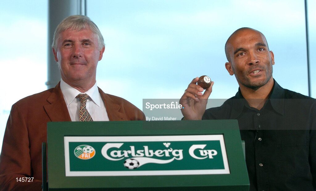 5 July 2004; Republic of Ireland U.21 manager Don Given, left, with former Republic of Ireland international Curtis Fleming at the draw for the second round of the 2004 Carlsberg FAI Cup at the Gravity Bar. Guinness Hopstore, Dublin. Picture credit; David Maher / SPORTSFILE