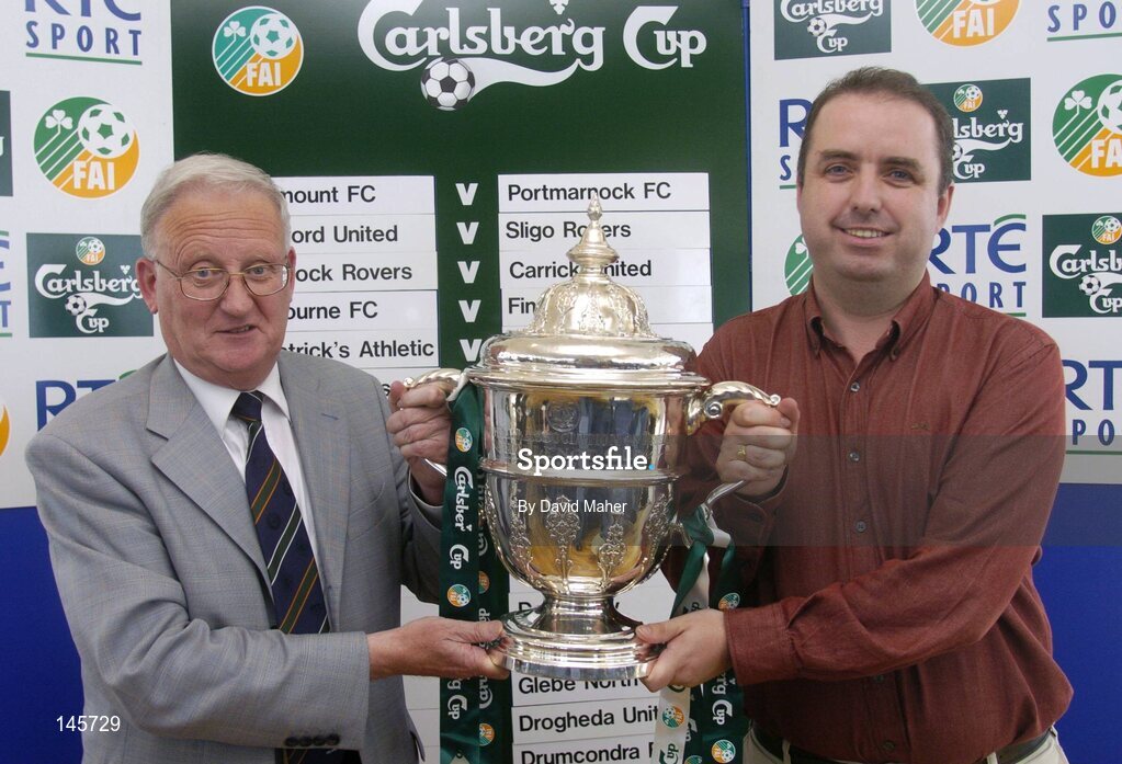5 July 2004; Michael Cody, left, Cobh Ramblers, and Gary Spain, Limerick F.C, at the draw for the second round of the 2004 Carlsberg FAI Cup at the Gravity Bar. Guinness Hopstore, Dublin. Picture credit; David Maher / SPORTSFILE