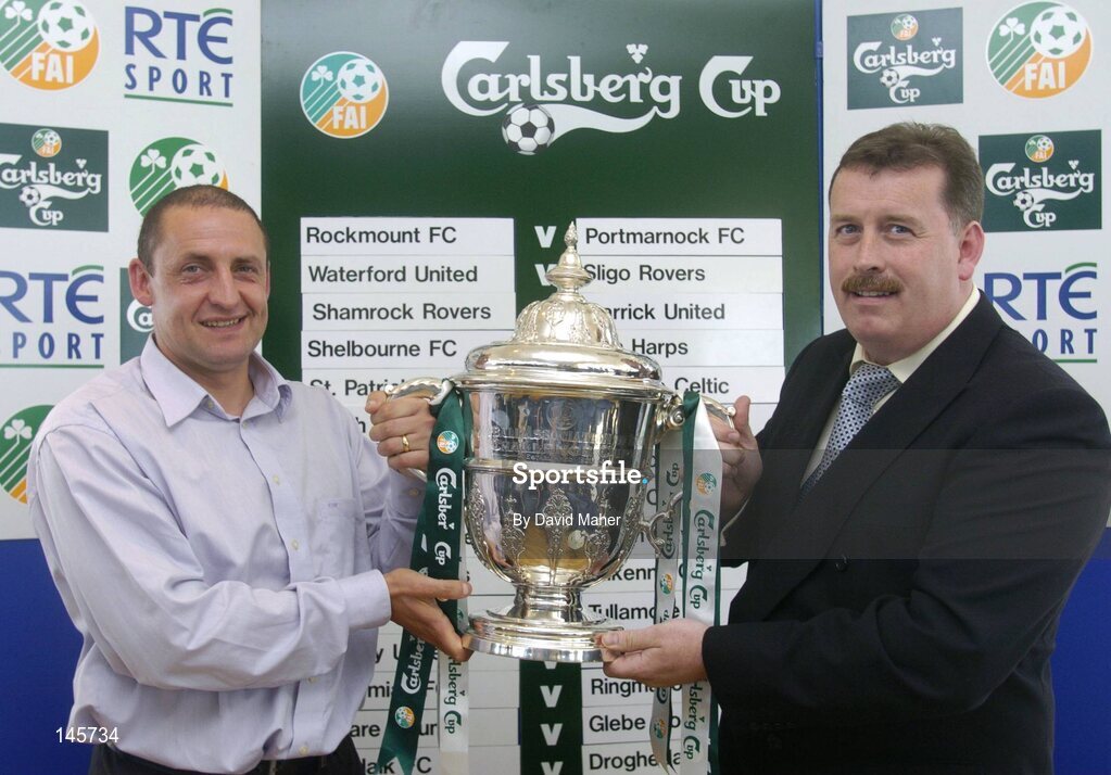 5 July 2004; Eddie Gormley, left, Bray Wanderers captain, with Ger Bickerstaffe, Kilkenny City manager, at the draw for the second round of the 2004 Carlsberg FAI Cup at the Gravity Bar. Guinness Hopstore, Dublin. Picture credit; David Maher / SPORTSFILE