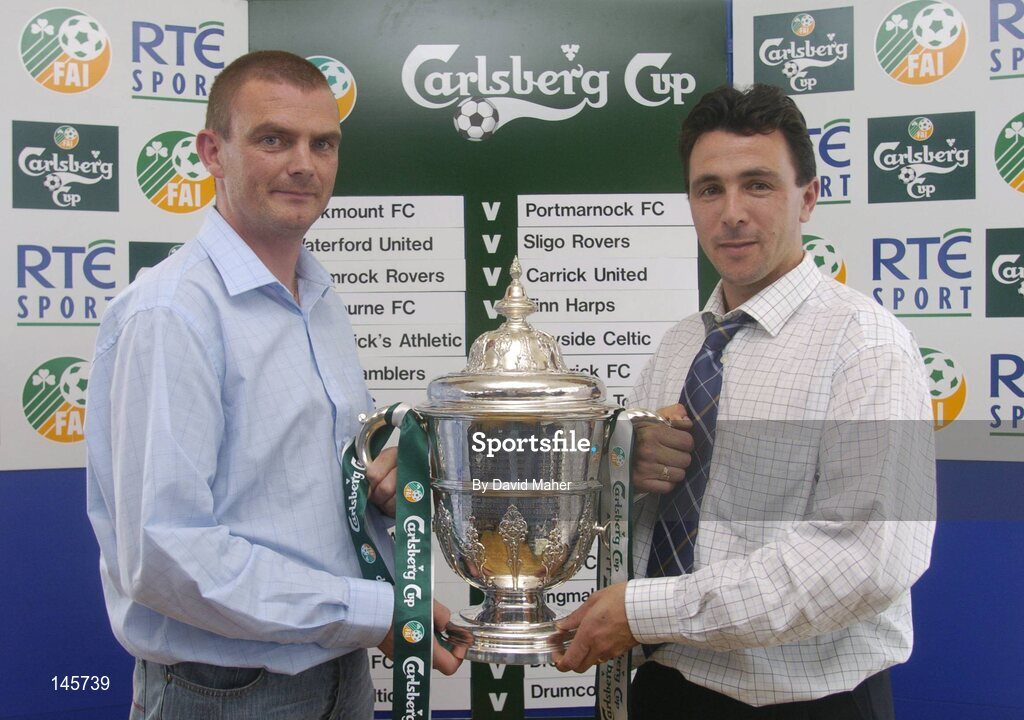 5 July 2004; Patrick Ruane, left, Tullamore F.C manager, with Stephen Kelly, Athlone Town manager, at the draw for the second round of the 2004 Carlsberg FAI Cup at the Gravity Bar. Guinness Hopstore, Dublin. Picture credit; David Maher / SPORTSFILE