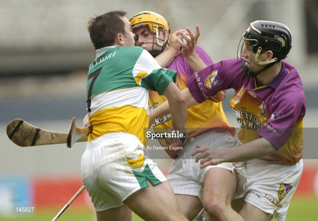 4 July 2004; Colm Cassidy, Offaly, in action against Michael Jacob, right, and Eoin Quigley, Wexford. Guinness Leinster Senior Hurling Championship Final, Offaly v Wexford, Croke Park, Dublin. Picture credit; Damien Eagers / SPORTSFILE