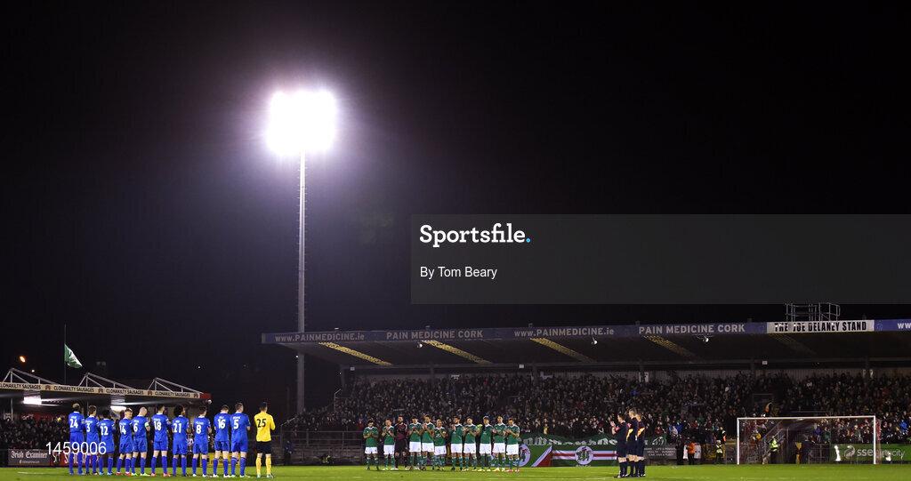 23 February 2018; Both teams during a minutes applause in memory of the late Liam Miller prior to the SSE Airtricity League Premier Division match between Cork City and Waterford at Turner's Cross in Cork. Photo by Tom Beary/Sportsfile Photo by Tom Beary/Sportsfile