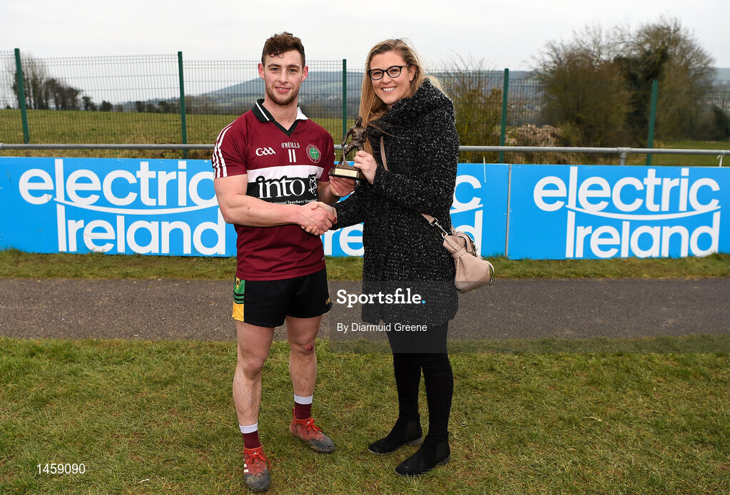 24 February 2018; Pictured is Lynne D’Arcy, Sponsorship, Electric Ireland, proud sponsor of the Electric Ireland GAA Higher Education Championships, presenting Conor Johnston from St Mary's University College, Belfast, with the Man of the Match award for his outstanding performance in the Electric Ireland Fergal Maher Cup Final between St Mary's University College and GMIT Letterfrack in Mallow, Cork. The unique quality of the Electric Ireland Higher Education Championships sees players putting their intercounty and club rivalries aside to strive to achieve Electric Ireland Fergal Maher Cup glory. Electric Ireland has been shining a light on these First Class Rivals as proud sponsor of the college level competitions for the next four years. #FirstClassRivals. Photo by Diarmuid Greene/Sportsfile