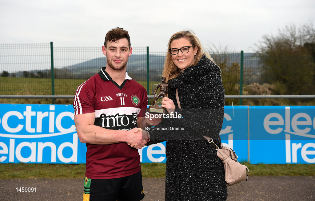 24 February 2018; Pictured is Lynne D’Arcy, Sponsorship, Electric Ireland, proud sponsor of the Electric Ireland GAA Higher Education Championships, presenting Conor Johnston from St Mary's University College, Belfast, with the Man of the Match award for his outstanding performance in the Electric Ireland Fergal Maher Cup Final between St Mary's University College and GMIT Letterfrack in Mallow, Cork. The unique quality of the Electric Ireland Higher Education Championships sees players putting their intercounty and club rivalries aside to strive to achieve Electric Ireland Fergal Maher Cup glory. Electric Ireland has been shining a light on these First Class Rivals as proud sponsor of the college level competitions for the next four years. #FirstClassRivals. Photo by Diarmuid Greene/Sportsfile