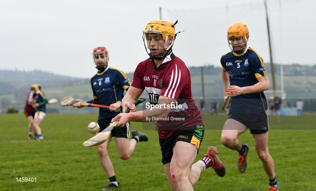 24 February 2018; Conor Johnston of St Mary's University College in action against Ronan Curr and Conor Criffin of NUIG Letterfrack during the Electric Ireland Fergal Maher Cup Final between St Mary's University College and NUIG Letterfrack in Mallow, Cork. The unique quality of the Electric Ireland Higher Education Championships sees players putting their intercounty and club rivalries aside to strive to achieve Electric Ireland Fergal Maher Cup glory. Electric Ireland has been shining a light on these First Class Rivals as proud sponsor of the college level competitions for the next four years. #FirstClassRivals. Photo by Diarmuid Greene/Sportsfile