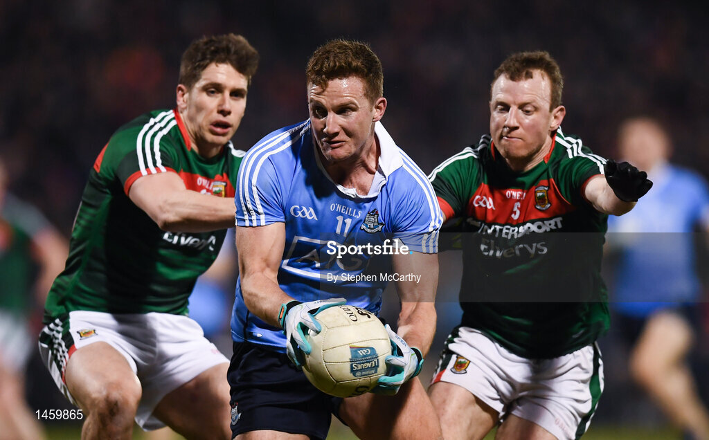 24 February 2018; Ciaran Kilkenny of Dublin in action against Lee Keegan, left, and Colm Boyle of Mayo during the Allianz Football League Division 1 Round 4 match between Mayo and Dublin at Elverys MacHale Park in Castlebar, Co Mayo. Photo by Stephen McCarthy/Sportsfile