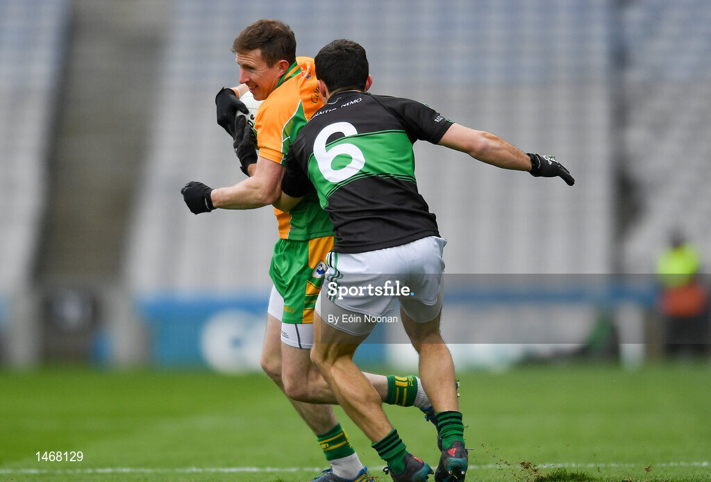 17 March 2018: Gary Sice of Corofin is tackled by Stephen Cronin of Nemo Rangers during the AIB GAA Football All-Ireland Senior Club Championship Final match between Corofin and Nemo Rangers at Croke Park in Dublin. Photo by Eóin Noonan/Sportsfile