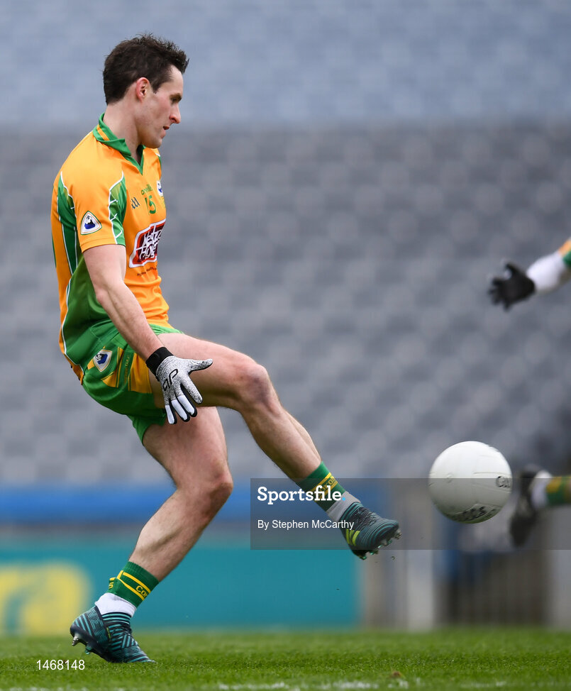 17 March 2018: Michael Farragher of Corofin shoots to score his side's second goal during the AIB GAA Football All-Ireland Senior Club Championship Final match between Corofin and Nemo Rangers at Croke Park in Dublin. Photo by Stephen McCarthy/Sportsfile