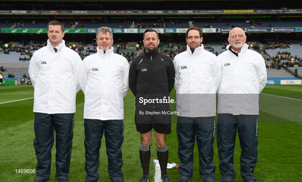 17 March 2018: Referee David Gough and his umpires prior to the AIB GAA Football All-Ireland Senior Club Championship Final match between Corofin and Nemo Rangers at Croke Park in Dublin. Photo by Stephen McCarthy/Sportsfile