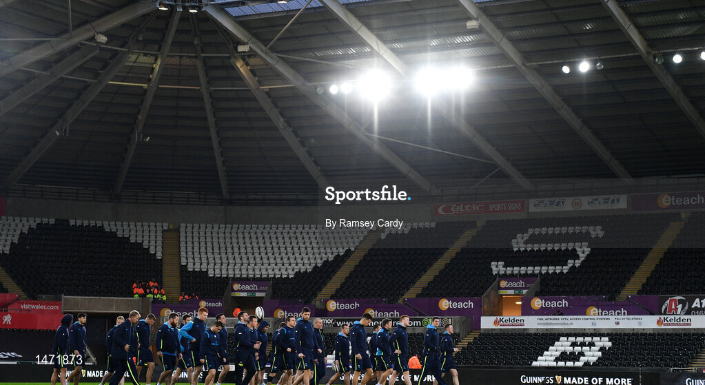 24 March 2018; The Leinster team walk the pitch ahead of the Guinness PRO14 Round 18 match between Ospreys and Leinster at the Liberty Stadium in Swansea, Wales. Photo by Ramsey Cardy/Sportsfile