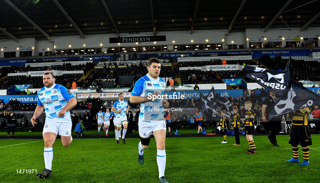 24 March 2018; Leinster captain Luke McGrath leads his side out ahead of the Guinness PRO14 Round 18 match between Ospreys and Leinster at the Liberty Stadium in Swansea, Wales. Photo by Ramsey Cardy/Sportsfile