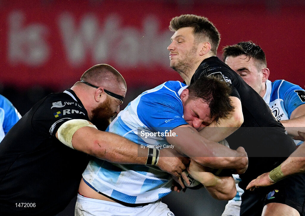 24 March 2018; Jordi Murphy of Leinster is tackled by Dmitri Arhip, left, and Dan Biggar of Ospreys during the Guinness PRO14 Round 18 match between Ospreys and Leinster at the Liberty Stadium in Swansea, Wales. Photo by Ramsey Cardy/Sportsfile