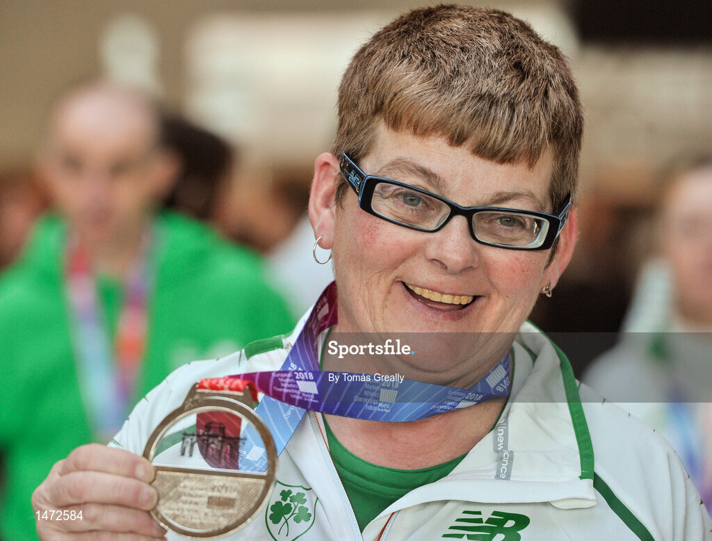 25 March 2018; Team manager Anne Gormley from Donore Harriers, Dublin, with her silver which she won in the Womens's over 40 walk event, during European Masters Indoor Track & Field Championships in Madrid, at Dublin Airport in Dublin. Photo by Tomás Greally/Sportsfile
