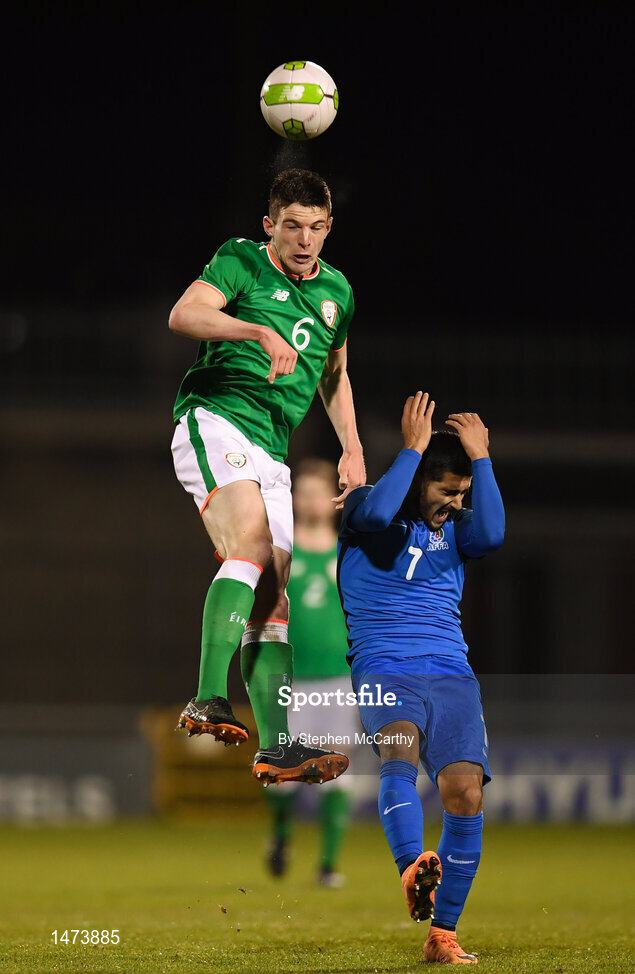 27 March 2018; Declan Rice of Republic of Ireland and Ehtiram Shahverdiyev of Azerbaijan during the UEFA U21 Championship Qualifier match between the Republic of Ireland and Azerbaijan at Tallaght Stadium in Dublin. Photo by Stephen McCarthy/Sportsfile