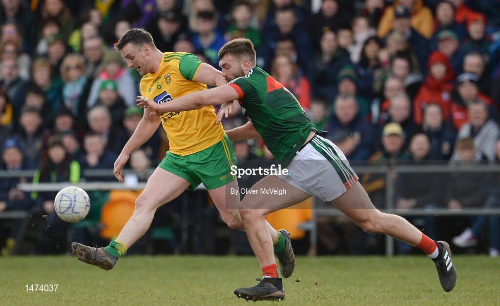 25 March 2018; Leo McLoone of Donegal in action against Seamus O'Shea of Mayo during the Allianz Football League Division 1 Round 7 match between Donegal and Mayo at MacCumhaill Park in Ballybofey, Donegal. Photo by Oliver McVeigh/Sportsfile