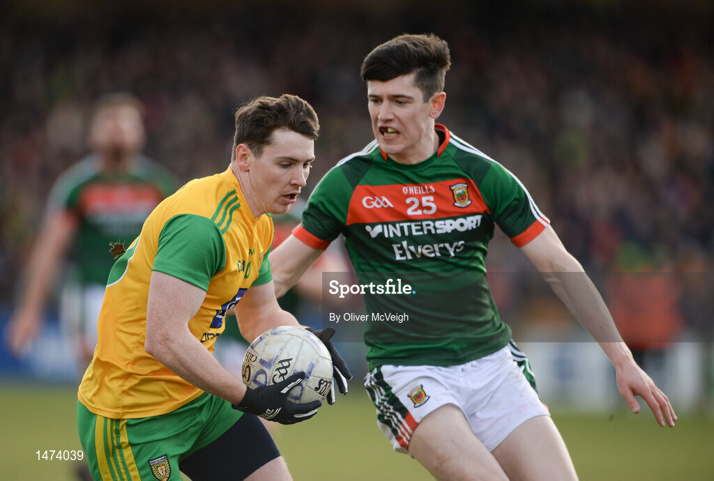 25 March 2018; Jamie Brennan of Donegal in action against Conor Loftus of Mayo during the Allianz Football League Division 1 Round 7 match between Donegal and Mayo at MacCumhaill Park in Ballybofey, Donegal. Photo by Oliver McVeigh/Sportsfile