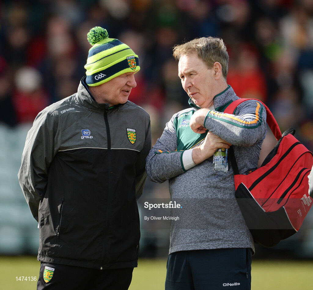 25 March 2018; Donegal manager Declan Bonner with team doctor Dr Kevin Moran, before the Allianz Football League Division 1 Round 7 match between Donegal and Mayo at MacCumhaill Park in Ballybofey, Donegal. Photo by Oliver McVeigh/Sportsfile