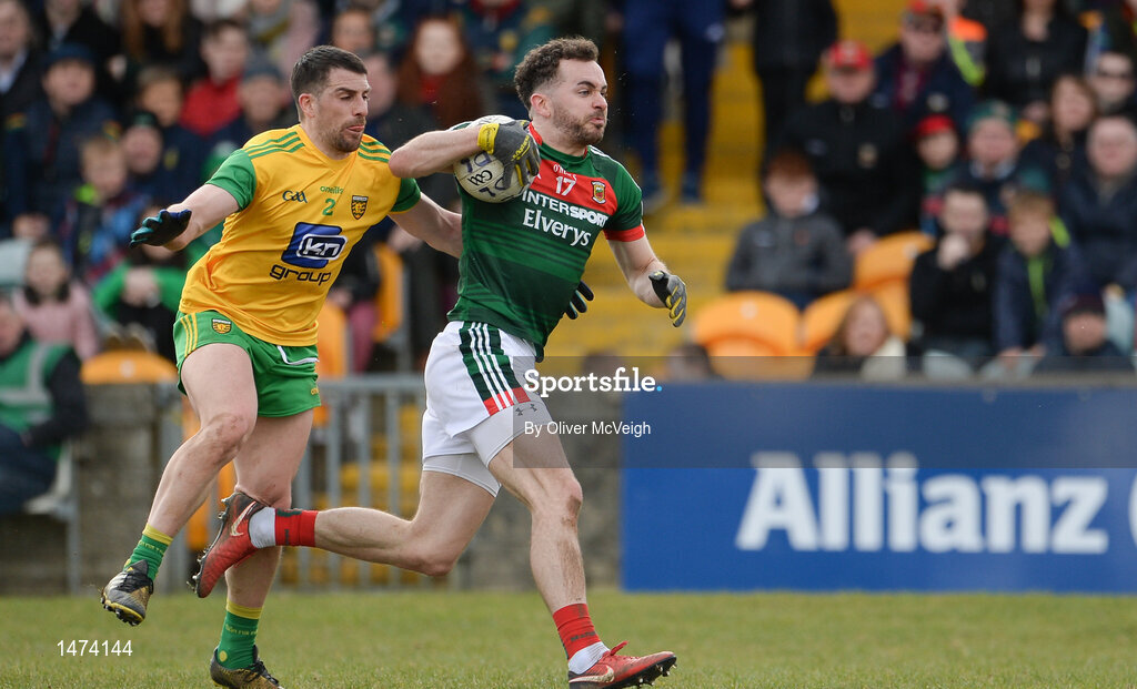25 March 2018; David Drake of Mayo in action against Paddy McGrath of Donegal during the Allianz Football League Division 1 Round 7 match between Donegal and Mayo at MacCumhaill Park in Ballybofey, Donegal. Photo by Oliver McVeigh/Sportsfile